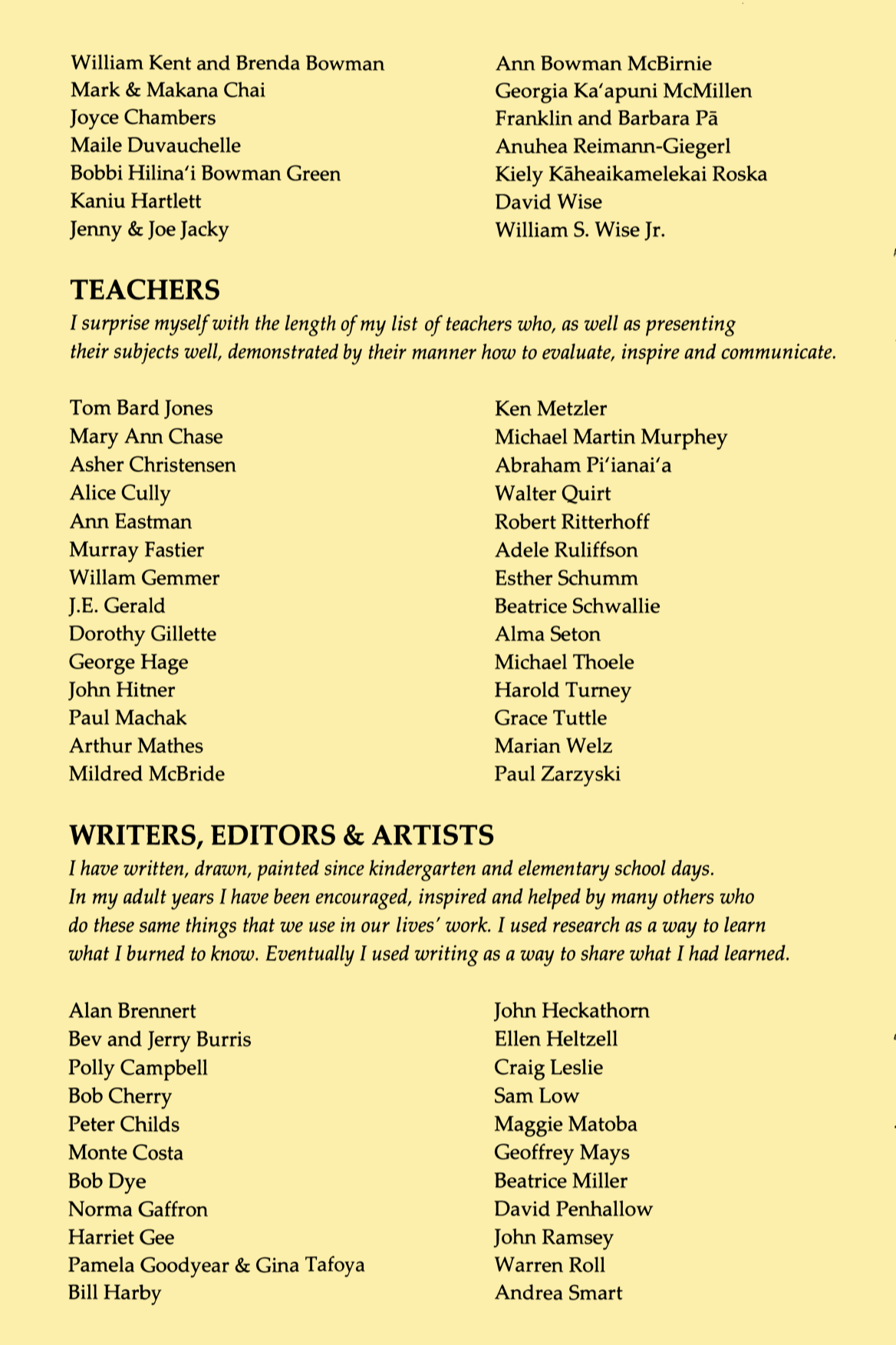 My mom grew up in the 1940s and ‘50s, a time when it was uncool to be Hawaiian. I grew up in the 1960s and ‘70s, a time when the Hawaiian Renaissance reawakened Hawaiian pride. Although we lived in the Pacific Northwest, our mother was paying attention. She shared the thirst for reconnection. While my brother and I were in high school and our mother worked in the University of Oregon’s publication department, she began a master’s program in journalism. She wrote her thesis on the Hawaiian Renaissance, digging into the changing culture with a reporter’s curiosity that also fed a personal journey. Later as a freelance magazine writer, she continued to write about Hawaiian issues as a way of educating herself and forging connections and friendships in addition to earning a living. She still maintains close ties with many of her interview subjects, some of whom are here today.