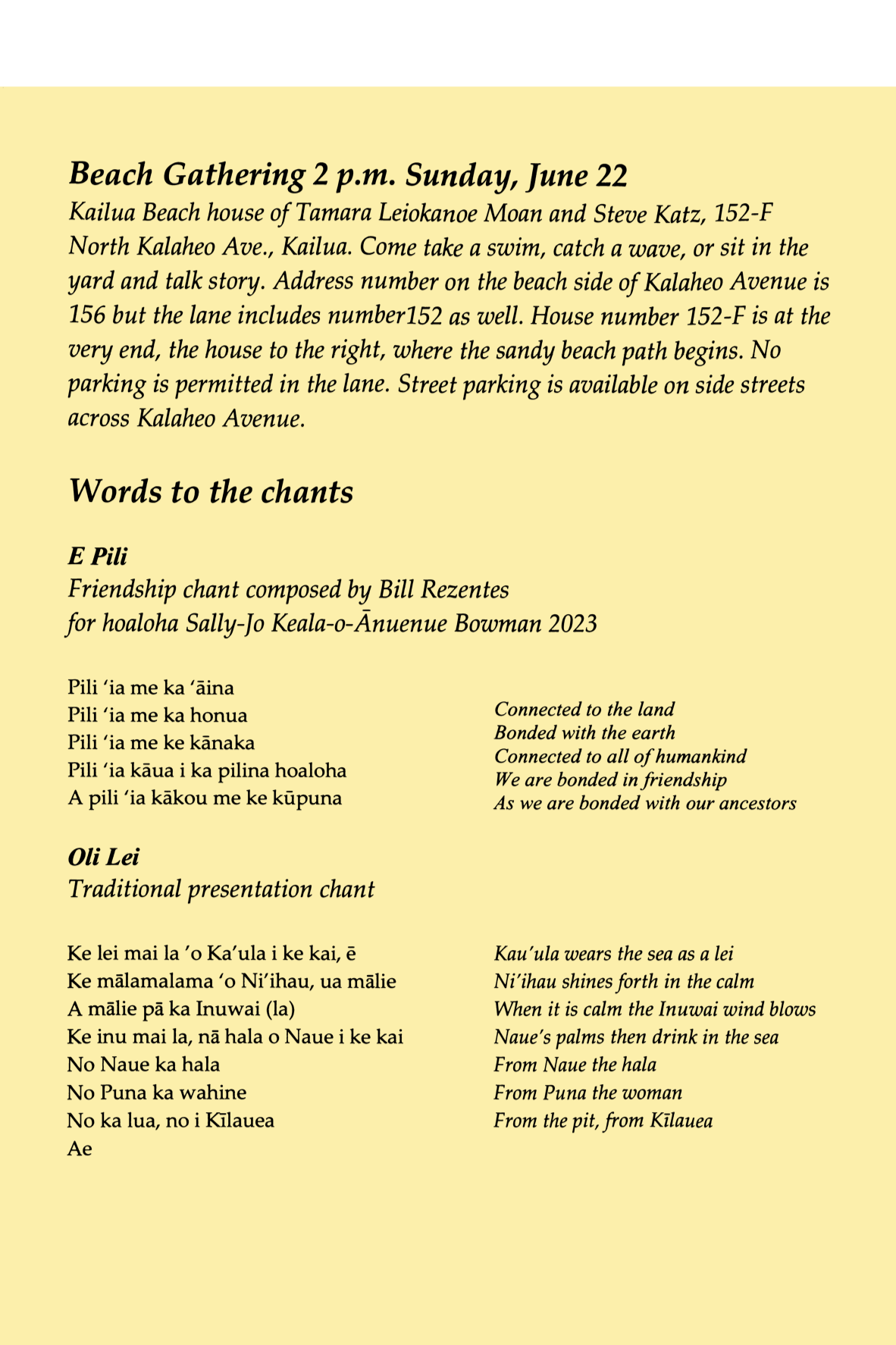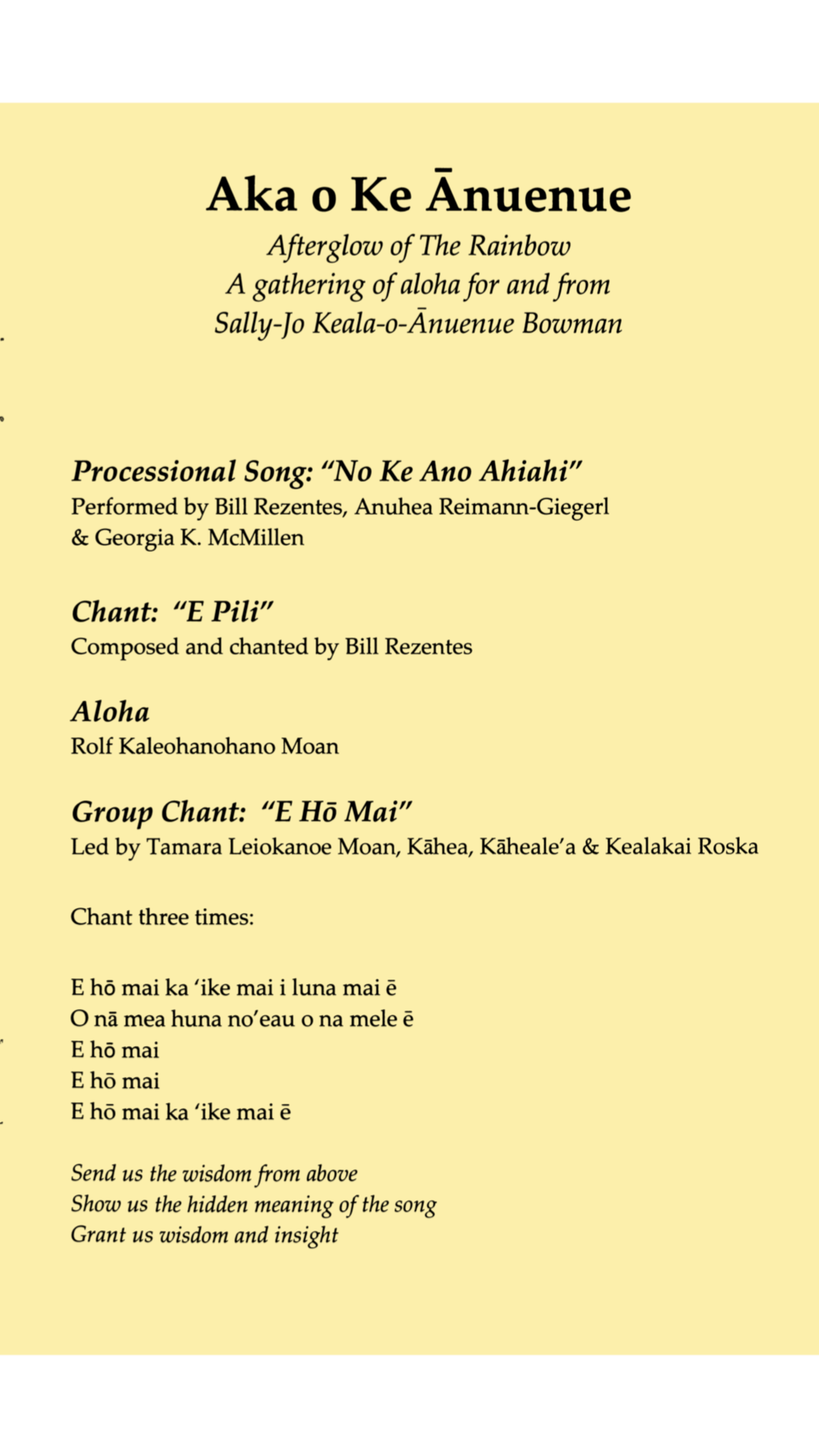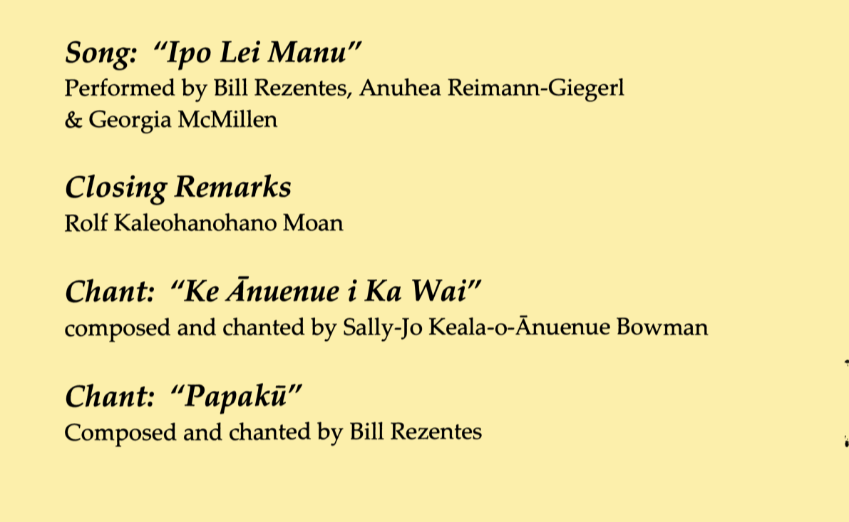 Daughter Tamara Leiokanoe Moan and granddaughter Juliet Keolaokeao Moan-Johnston lead the procession of program presenters. Following them are cousins Jenny Jacky, Kealakai, Kāheale’a and Kāheaikamelekai Roska, and my son, Rolf Kaleohanohano Moan.
