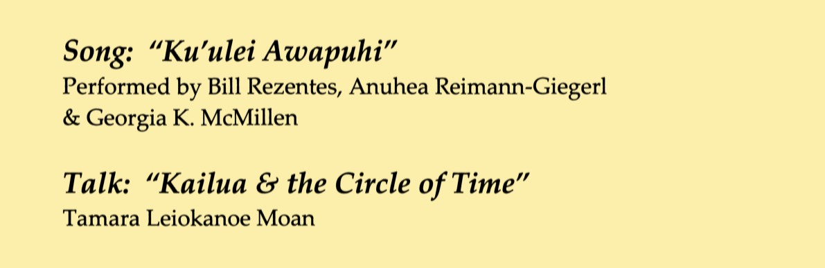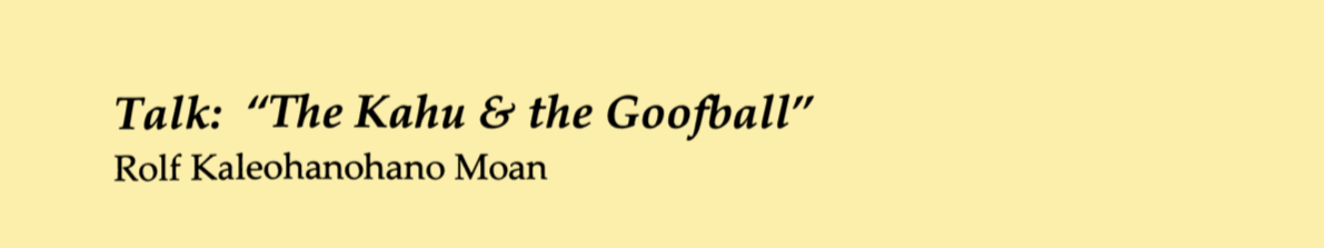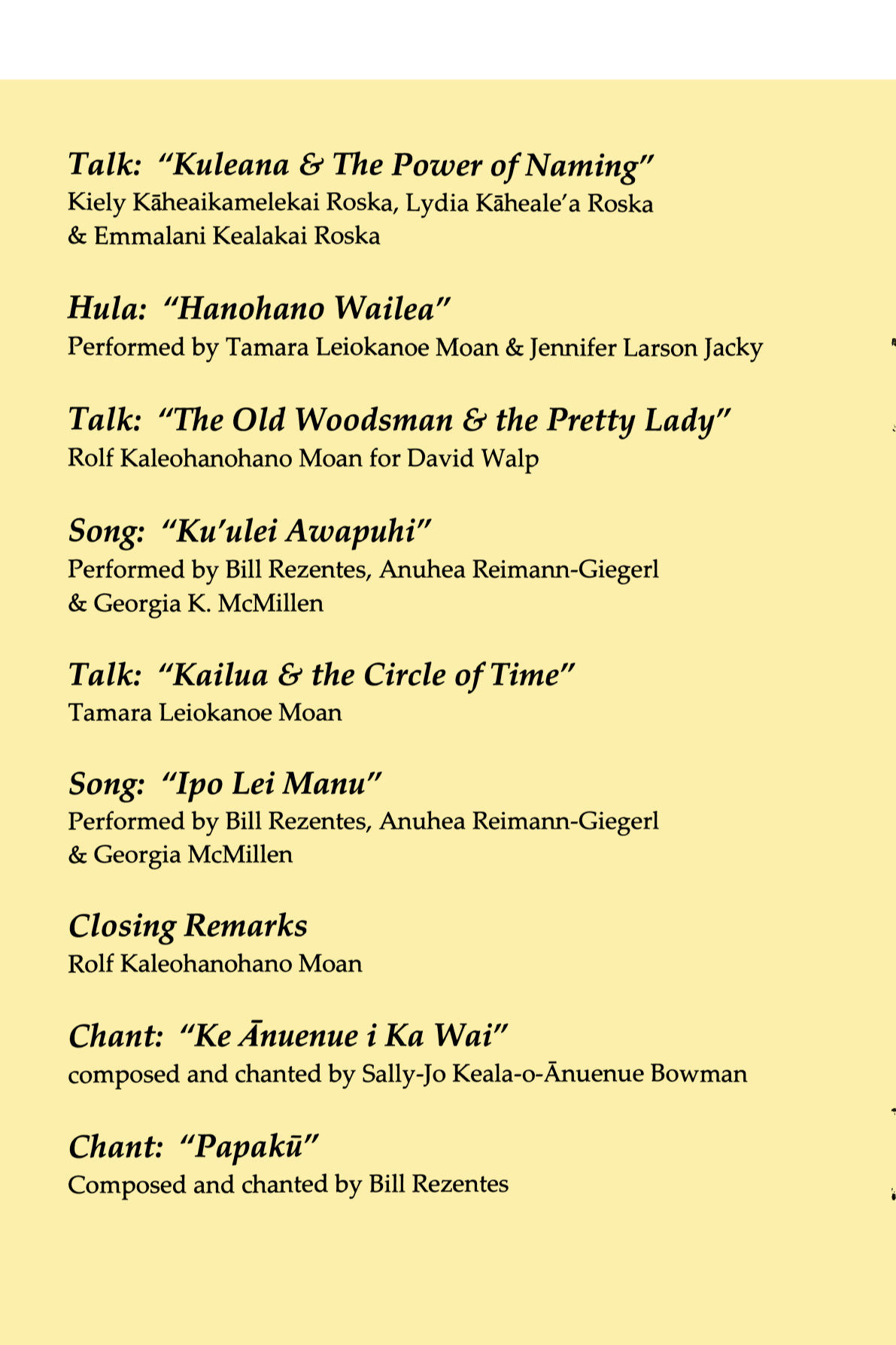 Son Rolf Kaleohanohano Moan gave his own talk as well as that of my husband, David Walp, who could not attend. Rolf also had the role of kahu for the event.