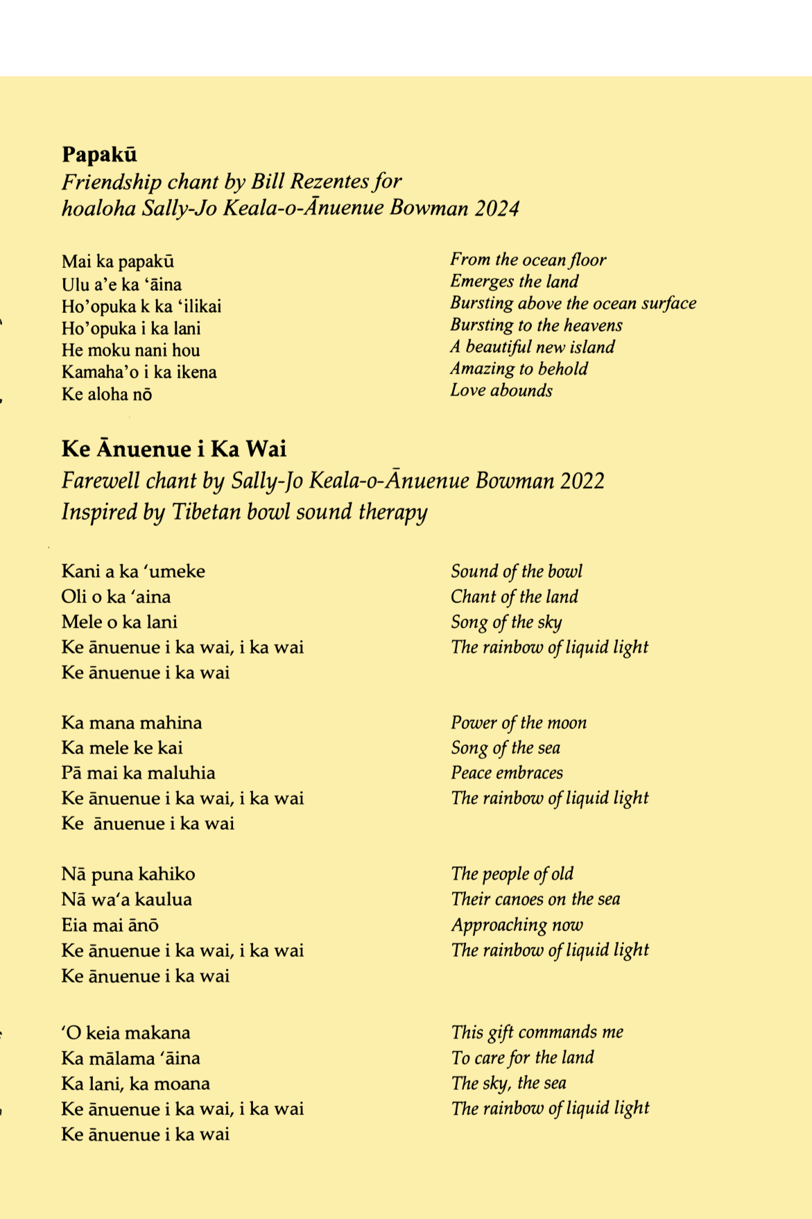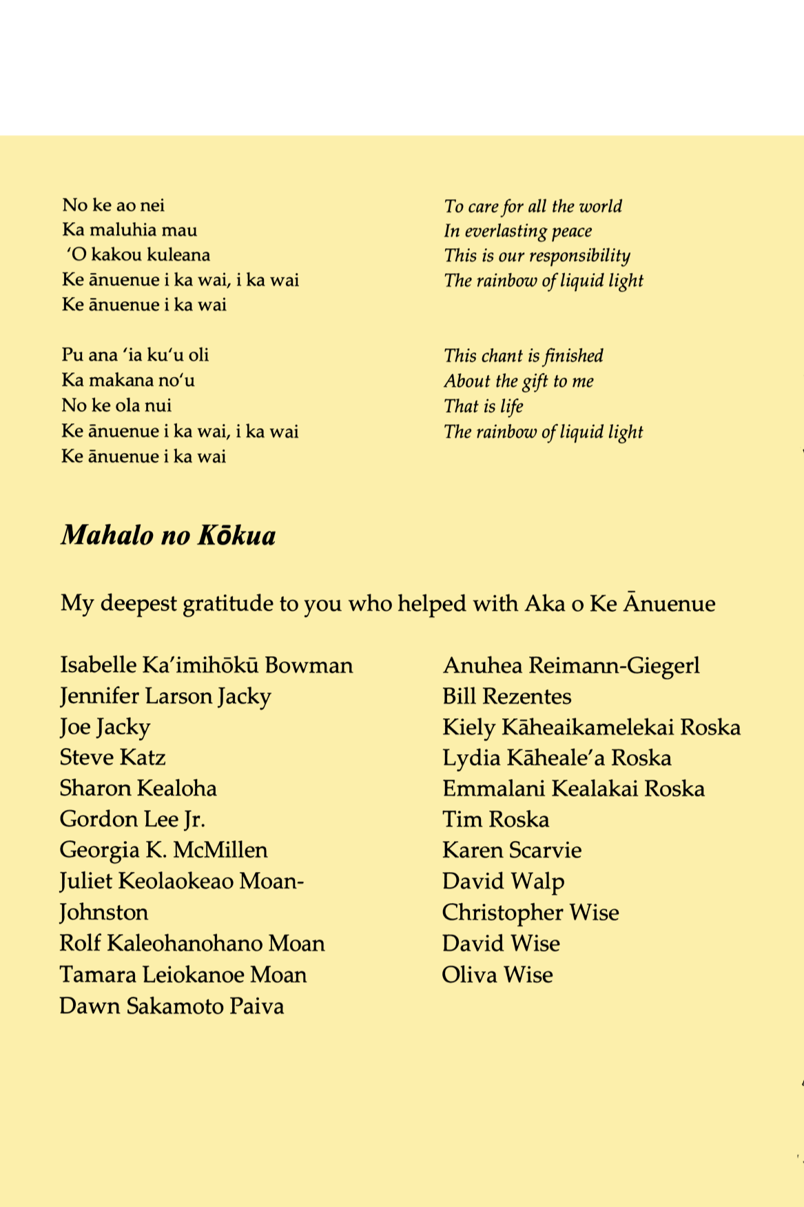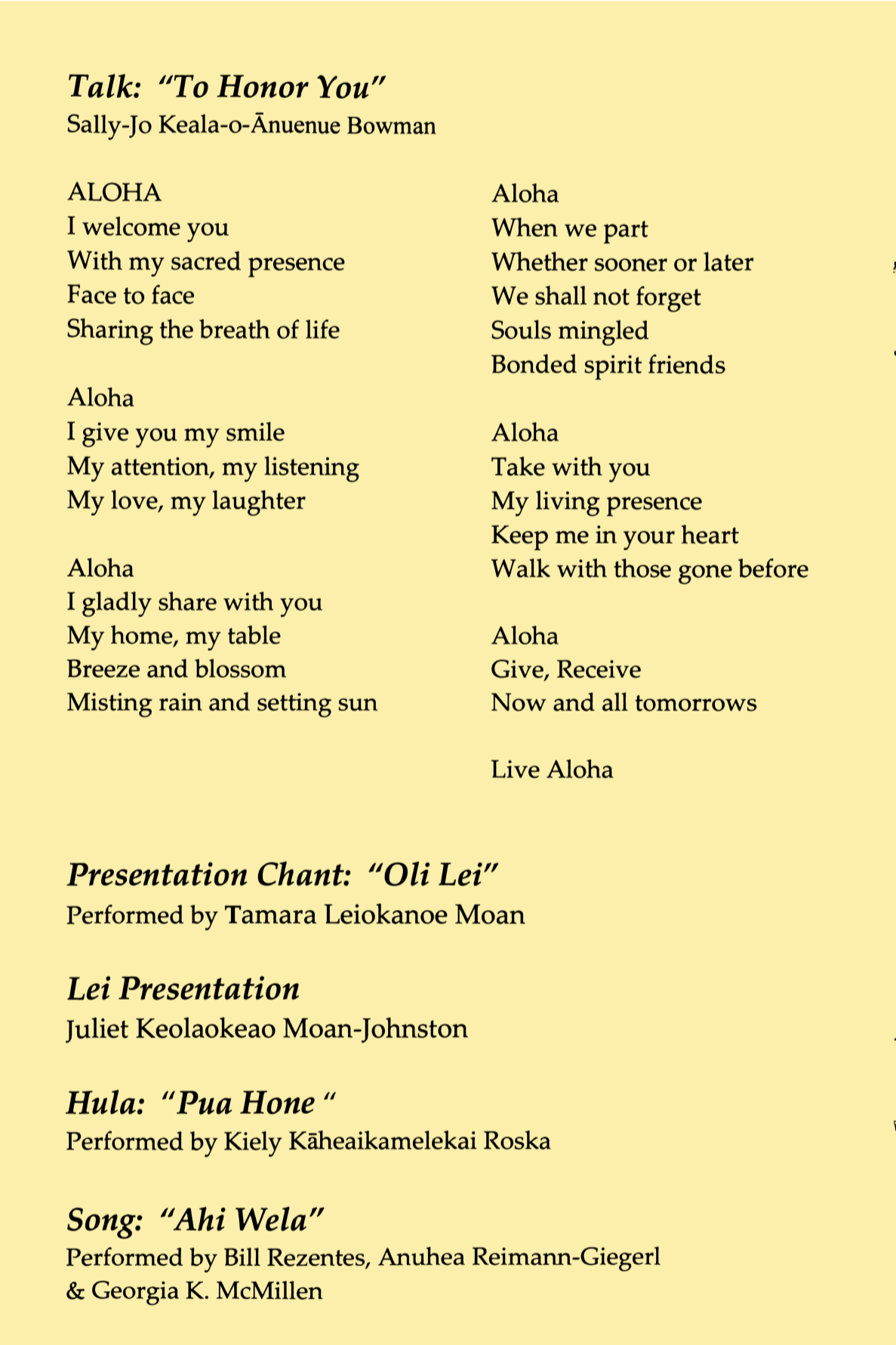Aloha no ‘oukou. I wrote the Aloha poem in your program in 2020 for my holiday card that year, as a gift from me to you. I have lately realized that it can also be a gift from you to someone else. I hope you will use it that way. Please join me now in reading it aloud together.