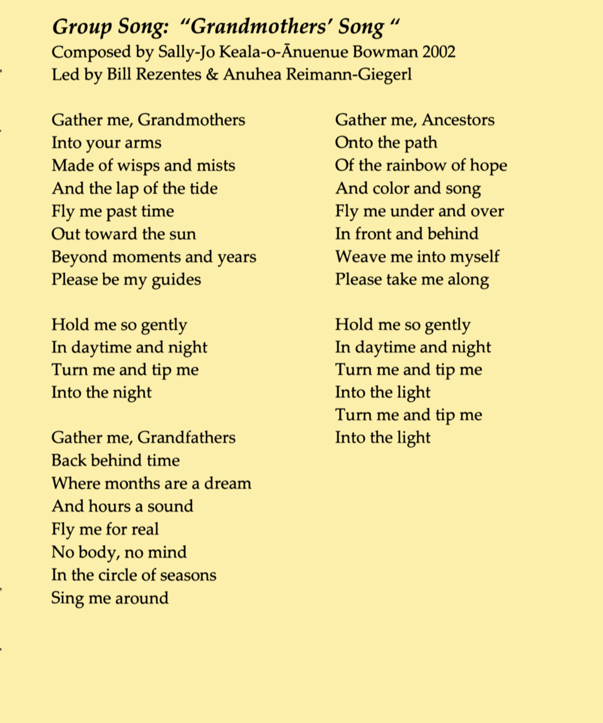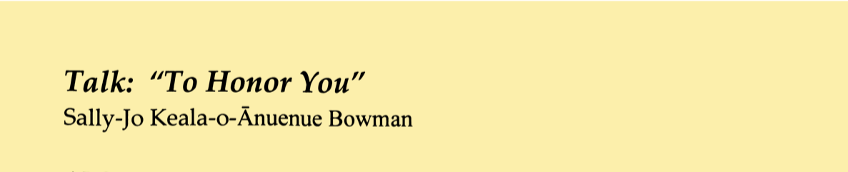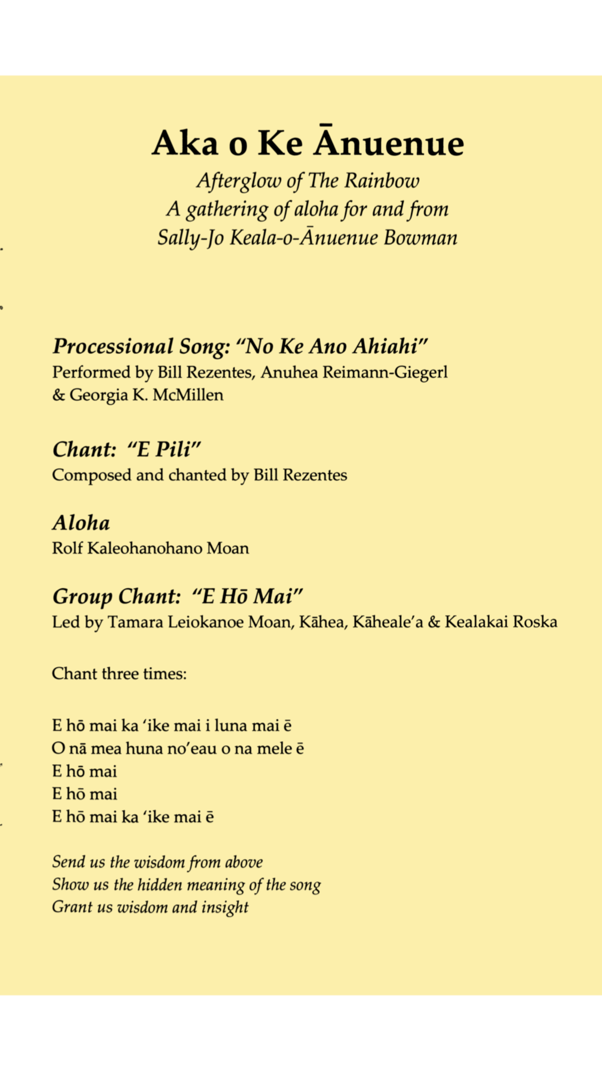 Aloha no ‘oukou. I wrote the Aloha poem in your program in 2020 for my holiday card that year, as a gift from me to you. I have lately realized that it can also be a gift from you to someone else. I hope you will use it that way. Please join me now in reading it aloud together.