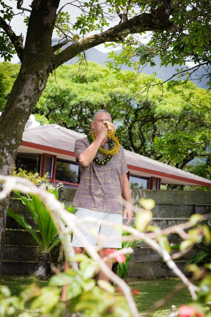 Cousin David Wise blows the pū, the shell trumpet, announcing the opening of Aka o Ke Ānuenue. The pū was made by my Kamehameha Schools classmate Gordon Lee. David’s home is the site of today’s event.
