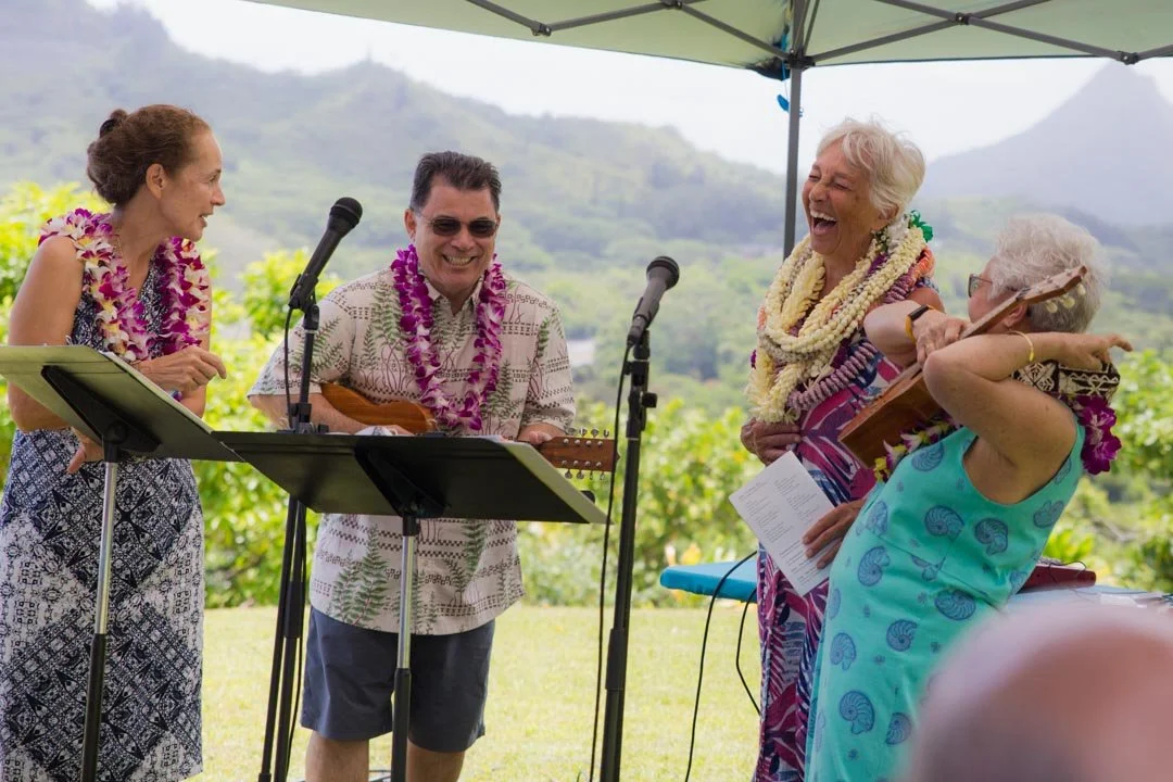 Did someone start in the wrong key? Or is there another reason for hilarity? Left to right: cousin Georgia McMillen, friend Bill Rezentes, myself, cousin Anuhea Reimann-Giegerl.
