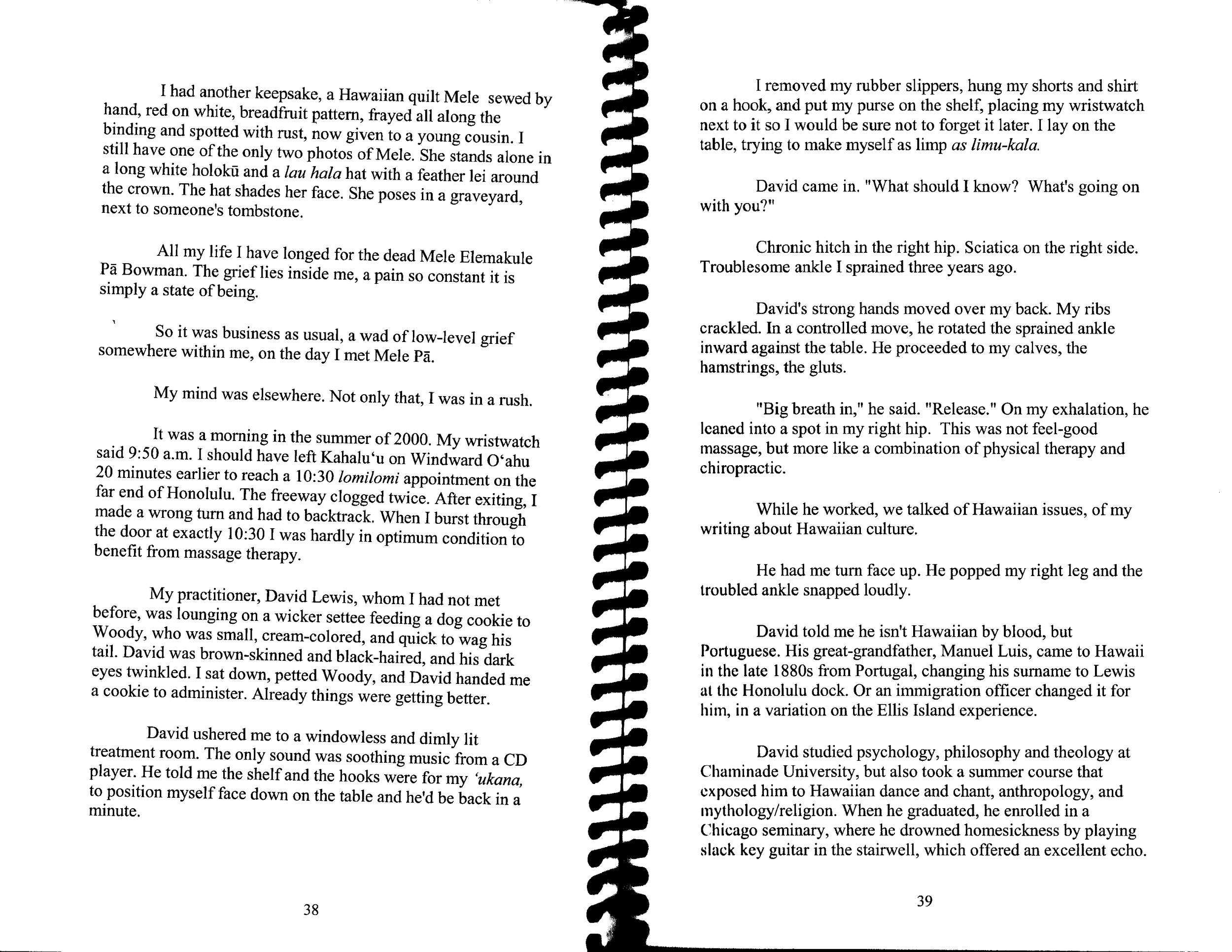 1996. She hoists herself from a chair and says, “Every time I stand up, it’s a victory over gravity.” On the other hand, such victory be damned, she also says, “I’m looking forward to hopping the twig.” She says, at her facetious best, “I got a certificate at the last interdenominational kupuna recognition day for being alive.” She describes her life as a long grind of burps, farts and involuntary whistles. “I keep trying to die, but something always comes up. But before I do die, I would like to make ZEPHYR on a triple word score.
