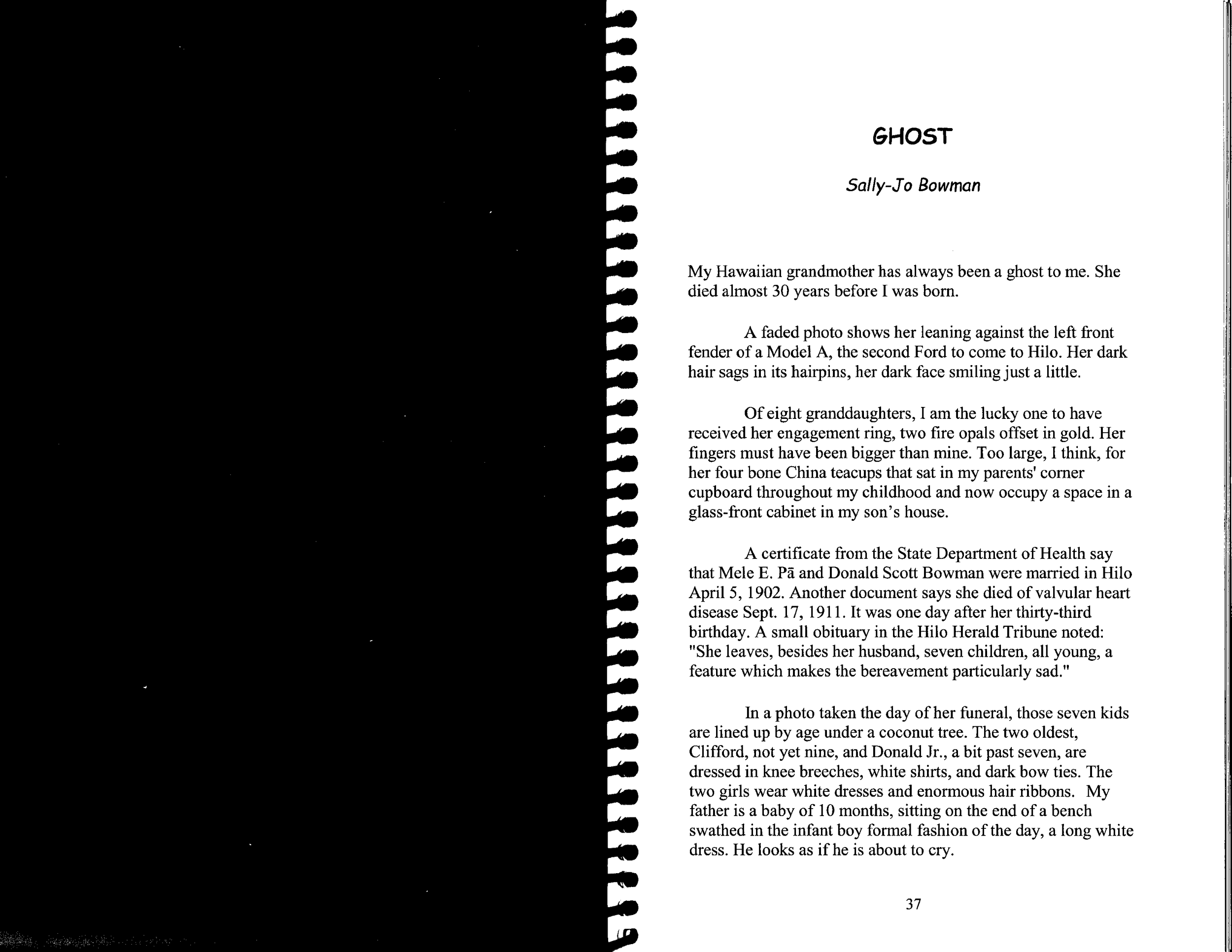 The wedding happened regardless. Miss Nobody said, “I wore satin underpants and a crappy short dress made by a seamstress at a Hilo dry goods store, pure white with lace medallions. And a hat that looked remarkably like a chamber pot.” She showed me a picture. The hat did look like a porcelain chamber pot I had once seen under the guest bed at the 19th century-vintage home of my grandfather.
