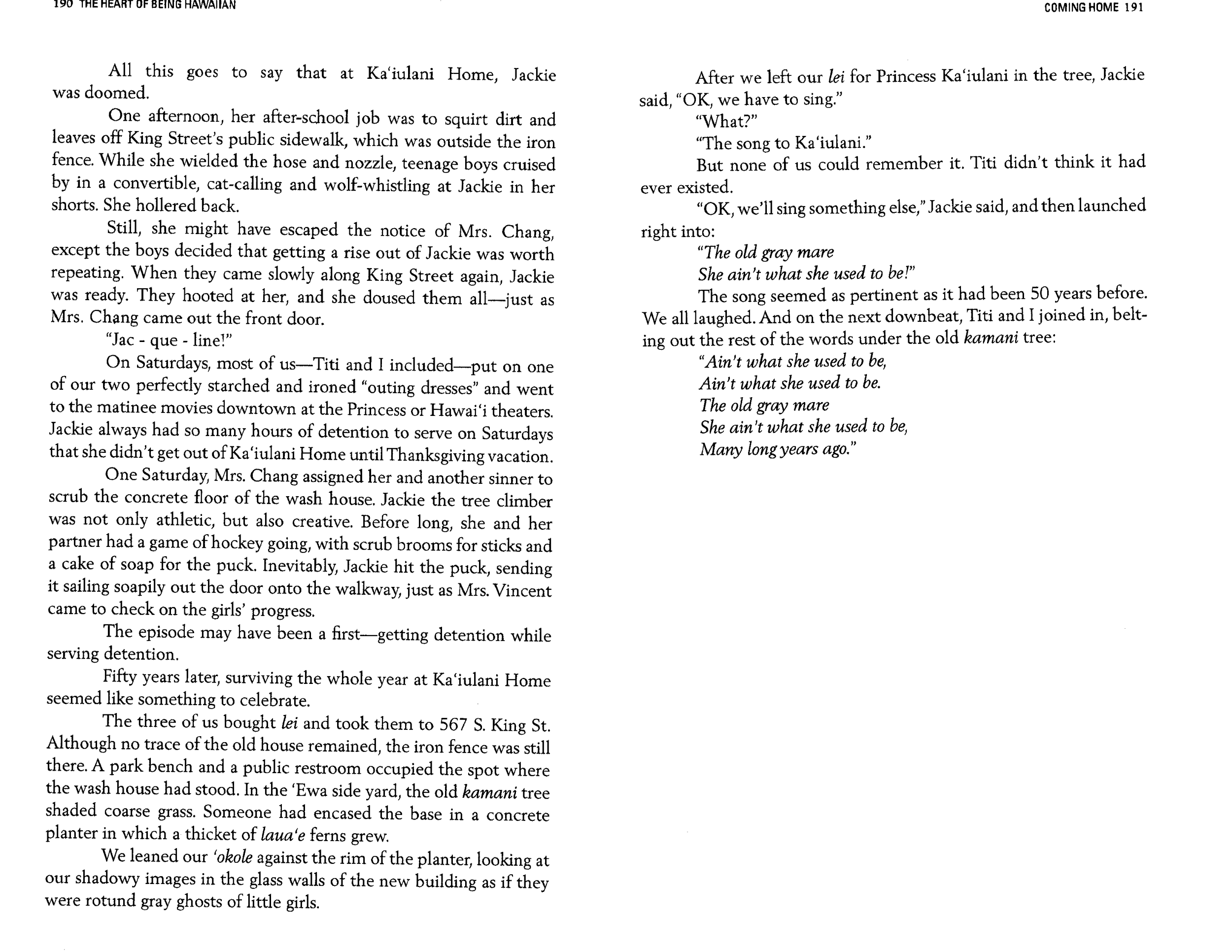 1999. We drive to the end of the road, where the trail switchbacks down a thousand feet to Pololū Valley. We stand at the overlook, the sea silver and wild below, and speak of how nature is good for the soul. On the way home, we stop at Hala‘ula. For once Aunty Betty is at a loss for words, pondering tall weeds growing through cracks in the concrete, roofs sagging dangerously, exterior walls stripped of paint by the unceasing Kohala winds, windows broken at the store where everyone once gathered. She points out the ruins of the movie theater, where the Red Sea had parted for the haoles. The shingles have rotted and the sugar mill has gone to rust. Only haole koa grows where the rows of identical little camp houses once stood. A cow switches its tail in cane grass gone wild. “Oh!” she almost whispers. “We thought it would never end. But it’s all gone! In one generation!”